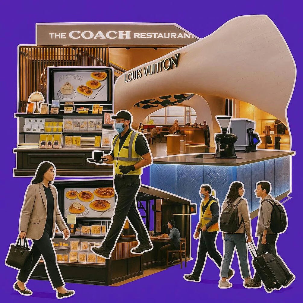 Airports are also evolving into culinary destinations, with brands and chefs opening ambitious dining concepts like Louis Vuitton’s café at Heathrow and Coach’s restaurant at Singapore’s Jewel Changi, turning terminals into places people would want to visit even without a flight.